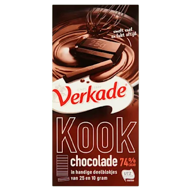 Verkade Kookchocolade heeft een uniek recept: het smelt sneller en het vloeit mooier dan gewone chocolade. Verkade Kookchocolade bestaat voor 74% uit cacao waardoor het een rijke chocoladesmaak heeft. Doordat op de handige deelblokjes het gewicht precies aangegeven staat, kun je zonder weegschaal aan de slag!