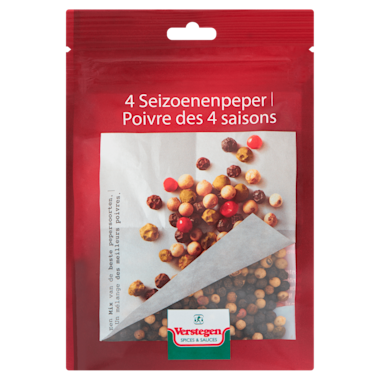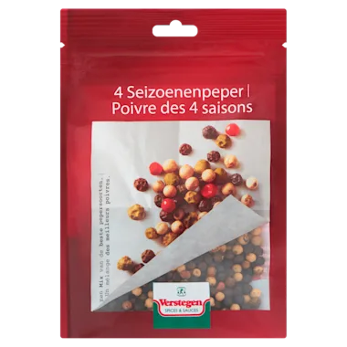 Ingrediënten: specerijen (94% pepers [witte peper, zwarte peper, groene peper], 5% roze peperbessen).