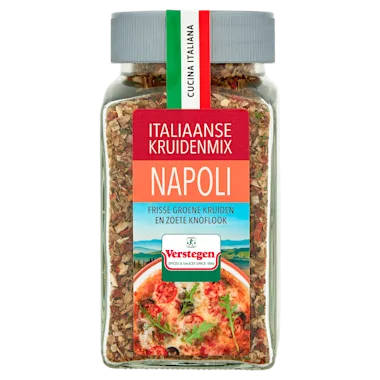 Ingrediënten: groenten (tomaat, 19% knoflook, sjalots), 37% kruiden (oregano, majoraan, basilicum, peterselie), specerijen (peper, chilies, venkelzaad).