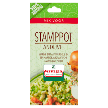 Bereidingswijze: schil 1 kg aardappels, snijd in kleine stukken en kook ze gaar. Giet de aardappels af, voeg deze mix, 50 g boter en 100 ml melk toe en stamp fijn. Spatel 400 g gesneden andijvie in delen door de puree. Lekker met krokante spekblokjes en een gefruit uitje.