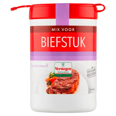 Bereidingswijze (voor 4 personen): wrijf 500 g biefstuk in met ca. 1 el (10 g) Verstegen mix en laat het even intrekken. Verhit 2 el (olijf)olie in een koekenpan, voeg een klontje boter toe en schroei de biefstuk op hoog vuur aan beide kanten dicht. Zet het vuur iets lager en voeg nog een klontje boter toe. Bak het vlees tot de gewenste garing (rosé, medium, doorbakken).