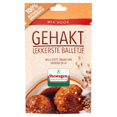 Bereidingswijze (voor 4 personen): meng deze mix met 500 g gehakt en voeg eventueel een ei toe. Draai gehaktballen en bak deze op matig vuur in 20 à 25 minuten mooi bruin en gaar.