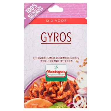 Bereidingswijze (voor 4 personen): bestrooi 1 kg in reepjes gesneden varkensvlees met deze mix en laat even intrekken. Bak de reepjes in hete olie of boter gedurende 5 à 7 minuten mooi bruin en gaar. Serveer de gyros in een pitabroodje met gesneden komkommer, rauwe ui en Verstegen yoghurt-knoflooksaus.