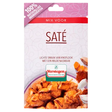 Bereidingswijze (voor 4 personen): meng 500 g blokjes kipfilet of varkenshaas met deze mix. Voeg eventueel naar smaak ketjap toe en laat het geheel even intrekken. Rijg de blokjes aan in water geweekte stokjes en rooster de saté op de BBQ of in de koekenpan gedurende 6 à 8 minuten rondom bruin en gaar. Heerlijk met Verstegen satésaus.