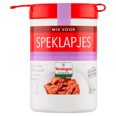 Bereidingswijze (voor 4 personen): wrijf 500 g speklapjes in met ca. ½ el (10 g) Verstegen mix en laat het even intrekken. Verhit 2 el (olijf)olie in een koekenpan en bak de speklapjes op matig vuur in ca. 20-25 min knapperig. Speklapjes kunnen ook gegrild worden op de BBQ in ca. 10-15 min.