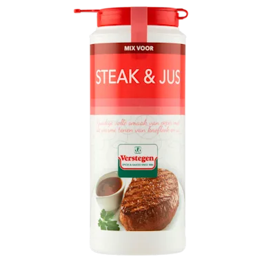 Benodigdheden (voor 4 personen): 500 g steak, ca. 1 el (8 g) Verstegen mix, ca. 50 g (vloeibare) boter, scheutje water. Bereidingswijze: laat de steak op kamertemperatuur komen en kruid het vlees met de Verstegen mix, laat even intrekken. Verhit een bakpan op hoog vuur en voeg (vloeibare) boter toe. Schroei de steak aan beide kanten dicht. Zet het vuur lager en voeg extra (vloeibare) boter toe in de pan, bedruip de steak daarmee. Bak het vlees tot de gewenste garing (rosé, medium, doorbakken). Haal het vlees uit de pan, laat het rusten en dek af met aluminiumfolie. Voeg een scheutje warm water toe aan het residu in de pan en laat de jus inkoken tot het de gewenste dikte heeft. Voeg eventueel extra kruiding toe aan de jus voor binding en/of smaak.