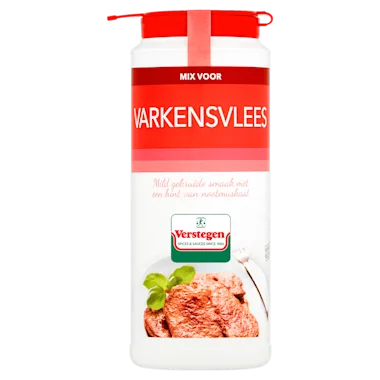 Variatietip: serveer het varkensvlees als saté. Snijd het vlees in blokjes, voeg (zonnebloem)olie en de Verstegen mix toe en marineer het gekruide vlees in ketjap/sojasaus. Bak het vlees gaar. Serveer met patat/frites, Verstegen Satésaus en een frisse salade.