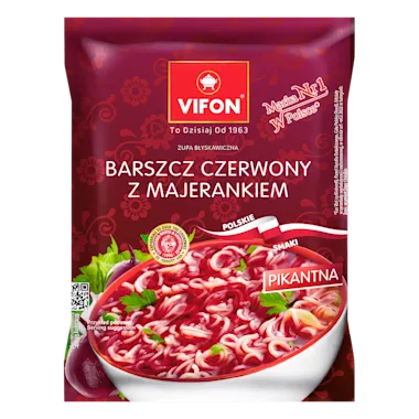 Ingrediënten: noedels (81,3%): TARWE bloem, palmvet, tapioca, zout, gemodificeerd zetmeel, suiker, stabilisatoren (E451, E412), rijsmiddelen (E501, E500), kurkuma, soep basis (18,7%): rode bieten poeder (45,6%), suiker, zout, zuurteregelaar (E330), gedroogde groenten in verschillende hoeveelheden (1,88%) (majoraan, laurierblad, peterselie), knoflookpoeder, smaakversterkers (E621, E627, E631), tomatenpoeder, peper, antiklontermiddel (E551), maltodextrine, aroma, geraffineerde palmolie, chilli extract.