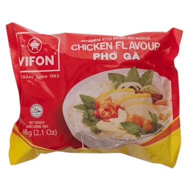 Ingrediënten: rijstnoedels (85,8%), rijst (90%), gemodificeerd zetmeel, suiker, zout, smaakversterker: mononatriumglutamaat; verdikkingsmiddel: guarpitmeel; smaaktoevoegingen (14,2%): zout, palmolie, smaakversterkers: mononatriumglutamaat, natriumguanylaat, dinatriuminosinaat; suiker, aroma, getextureerde TARWEGLUTEN (2,8%), gedroogde bieslook (2,4%), rode sjalot (2%), pho-specerijen in wisselende proporties (1,8%): kaneel, kruidnagel, anijs; gember (1,4%), gedroogde koriander (0,5%), kleurstoffen: karamel, carotenen; peper (0,3%), chili (0,2%), antioxidant; tocoferolrijk extract.
