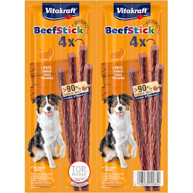 Wil je je hond verrassen met een heerlijke hondensnack? Trakteer je geliefde huisdier eens met de Vitakraft Beef Stick Kalkoen. Waarom? Omdat deze vleessnack een onweerstaanbare geur en rijke vleessmaak heeft, waar geen enkele hond genoeg van kan krijgen. Bovendien heeft de Beef Stick Kalkoen een volle vleessmaak, omdat deze hondensnack een extra hoog vleesgehalte van meer dan 90% heeft. Daarom is deze vleesstick zo onweerstaanbaar lekker! Daarnaast kun je deze stick eenvoudig in kleine stukken breken voor extra veel verwenmomenten. Deze hondensnack is voor elke gelegenheid een goed keuze! Van liefdevol verwennen tot rijkelijk belonen. Of als tussendoortje voor de kleine trek. Ga je samen erop uit? Ook dan is de Beef Stick Kalkoen een handige hondensnack om op zak te hebben. Door de scheurverpakking is deze vleessnack ideaal voor onderweg.