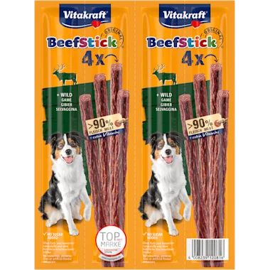 De hondensnack die altijd in de smaak valt. Ben je op zoek naar een overheerlijke hondensnack voor je hond? Verras je geliefde viervoeter dan met de Vitakraft Beef Stick Wild. Ten eerste heeft deze vleessnack een onweerstaanbare geur en rijke vleessmaak waar elke hond van gaat kwijlen. Verder heeft de Beef Stick Wild een pure vleessmaak, want deze hondensnack heeft een extra hoog vleesgehalte van meer dan 90%. Dat maakt deze vleesstick een absolute favoriet. Ook kun je deze stick eenvoudig in kleinere stukken breken voor meer verwenmomenten. Deze hondensnack is dan ook geschikt voor elke gelegenheid. Van liefdevol verwennen tot rijkelijk belonen. Of als tussendoortje voor de kleine trek. Ga je samen op pad? Ook dan is de Beef Stick Wild een handige hondensnack om op zak te hebben. Door de scheurverpakking is deze vleessnack ideaal voor onderweg. Onweerstaanbaar lekker. Laat je verrassen door de Vitakraft Beef Stick Wild. Door de topkwaliteit, de verrukkelijke geur, het zeer hoge vleesgehalte en de unieke smaak kan het geluk van je hond niet meer op. Overigens is deze smakelijke hondensnack verkrijgbaar in verschillende smaken, waaronder wild. Welke smaak je ook kiest, het wordt gegarandeerd smullen! Wist je dat de Beef Stick Wild een suikervrij receptuur heeft en geen kleurstoffen, conserveringsmiddelen en smaakversterkers bevat? Dat maakt deze hondensnack niet alleen extra lekker, maar ook heerlijk puur van smaak! Kortom, de Beef Stick Wild is pure verwennerij voor je geliefde hond.