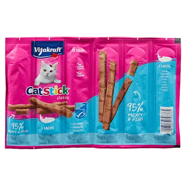 Wil jij je lieve kat verwennen met een lekkere kattensnack boordevol liefde? Verras je huisdier dan met de populaire Cat Stick zalm! Een heerlijke lekkernij die jouw liefde laat blijken. Deze kattensnoepjes hebben een extra hoog vleesgehalte van maar liefst 95%. Dit maakt de Cat Stick een echte favoriet voor veel katten. Deze kattensticks kun je gemakkelijk in kleine stukken breken dankzij de handige afbreekpunten. Hiermee kun je nog meer verwenmomenten creëen om jouw liefde aan je kat te uiten en kan je lieve huistijger nog vaker genieten van deze smakelijke kattensnoepjes. De Cat Sticks zijn per drie stuks, afzonderlijk in folie verpakt om de versheid van de kattensnack te garanderen.