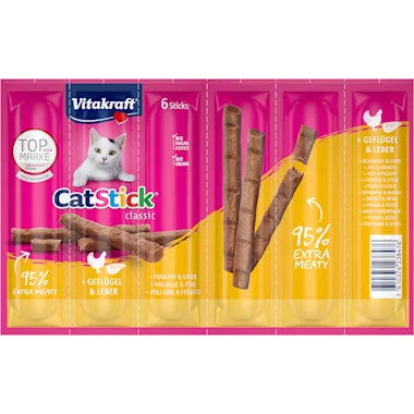 Ben je ook zo gek op je kat en wil je je lieve huisdier eens goed verwennen? Kies dan voor de Vitakraft Cat Stick Gevogelte & Lever! Deze onweerstaanbare kattensnack is razend populair bij katten. De Vitakraft Cat Sticks zijn namelijk extra vlezig, want deze kattensticks hebben een extra hoog vleesgehalte van maar liefst 95%. Dat kan natuurlijk geen enkele kat weerstaan! De Cat Stick heeft handige afbreekpunten op de stick waardoor je de kattensnack eenvoudig in kleinere stukken kunt breken. Zo creëer je nóg meer verwen-momenten voor je kat en kun je je liefde voor je kat nog vaker uiten. Wat een luxe zeg.