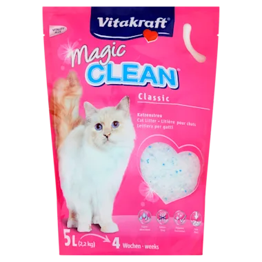 Heb je een lieve kat, maar nog niet de juiste kattenbakvulling gevonden? Dan is Vitakraft® MAGIC CLEAN® misschien wel iets voor jou! Deze hygiënische kattenbakvulling, gemaakt van mineraalkorrels, absorbeert vocht en geurtjes binnen enkele seconden, waardoor de activiteit van bacteriën wordt geremd en je kattentoilet altijd schoon blijft. MAGIC CLEAN® is niet alleen vier keer productiever dan conventionele kattenbakvulling, maar ook bijzonder stofarm, ideaal voor mensen met een allergie. Bovendien is de vulling zuinig in gebruik en kun je er een hele maand mee doen! Het handige transportgewicht en de mogelijkheid om het via de compost weg te gooien, maken het bovendien extra praktisch. Kortom, met MAGIC CLEAN® heb je een schone, frisse kattenbak – het lijkt wel magie!