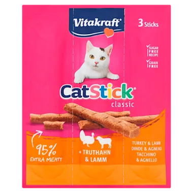 Wil je jouw kat verwennen met een onweerstaanbare snack? De Vitakraft® Cat Stick® Kalkoen & Lam is een echte favoriet dankzij het extra hoge vleesaandeel van 95%. De heerlijke geur en sappige structuur maken deze snack perfect als beloning of tussendoortje.