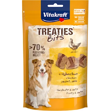 Op zoek naar een zachte en smaakvolle traktatie voor je hond? De Vitakraft® Treaties Bits met kip wordt op een unieke manier bereid: rijk aan vlees, gevuld met een hartige vulling en zachtjes gegaard in de oven. Dit zorgt voor een sappige, onweerstaanbare snack waar je hond dol op zal zijn. Met een hoog vleesaandeel en zonder granen, soja of toegevoegde suikers is dit een verantwoorde lekkernij. Bovendien zijn Treaties Bits ideaal om een pilletje in te verstoppen. Een smakelijk vleeshapje waar jouw hond gegarandeerd van gaat kwispelen!