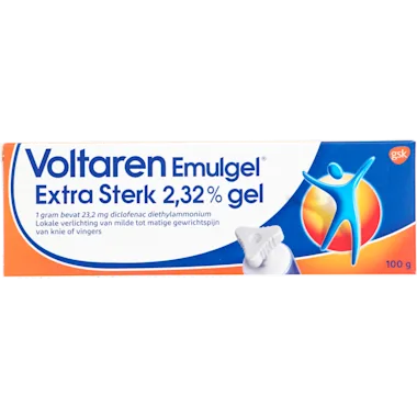 Voltaren Emulgel Extra Sterk 2,32% is een ontstekingsremmende gel die wordt gebruikt voor de lokale verlichting van milde tot matige gewrichtspijn, zoals veroorzaakt door artrose, in de knieën en vingers. Voltaren Emulgel Extra Sterk bevat een extra sterke concentratie (2,32%) diclofenac, een niet-steroïdale ontstekingsremmer (NSAID). Diclofenac werkt pijnstillend en ontstekingsremmend in de bron. De pijnverlichting van Voltaren Emulgel bouwt zich geleidelijk op gedurende de eerste week van de behandeling. 1 keer aanbrengen per 12 uur op de te behandelen plek. Voltaren Emulgel Extra Sterk 2,32% nu met een nieuwe makkelijk te openen dop in 1 klik. Voltaren Emulgel 2,32% (diclofenac diethylammononium) is een geneesmiddel. Voltaren niet gebruiken gedurende het laatste trimester van de zwangerschap. Lees voor gebruik de bijsluiter.