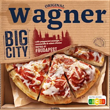 Pizza belegd met pepperoniworst en kaas, diepgevroren.