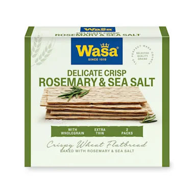 Wasa Delicate Crisp Rosemary is een extra dunne, krokante cracker gebakken van volkoren tarwemeel. De smaak van rozemarijn en zeezout maakt het tot een hartige cracker, die rijk aan vezels is.