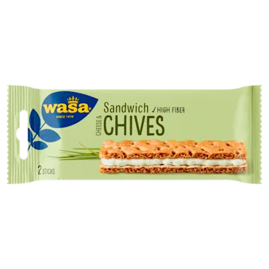 Wasa Sandwich Cheese & Chives bestaat uit twee repen knäckebröd met een vulling met kaas- en bieslooksmaak. Rijk aan vezels en geschikt voor ieder moment van de dag.