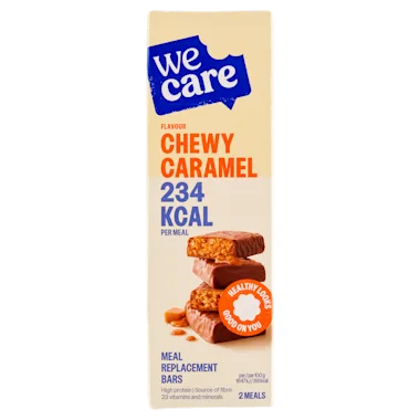Maaltijdvervangend Product voor Gewichtsbeheersing, Repen Omhuld met Melkchocolade met Vulling van Karamel en Granenbolletjes.