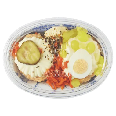 Ons zalm slaatje wordt gemaakt van zorgvuldig geselecteerde aardappelen, ASC-gecertificeerde zalm, en een mix van knapperige groenten zoals wortel, ui, en augurk. Perfect als tussendoortje, thuis of onderweg!<lt/>br/<gt/> <lt/>br/<gt/> - Bereid met ASC-gecertificeerde zalm, duurzaam en lekker<lt/>br/<gt/> - Het lekkerste tussendoortje op aardappelbasis<lt/>br/<gt/> - Een kant-en-klaar slaatje, perfect voor één persoon<lt/>br/<gt/> - Smeuïge salade met wortel, ui, en augurk<lt/>br/<gt/> - Met zorg en vakmanschap gemaakt, proef de kwaliteit.<lt/>br/<gt/> <lt/>br/<gt/> Over ons zalm slaatje: Ons zalmslaatje is gemaakt van zorgvuldig geselecteerde aardappelen, duurzame ASC-gecertificeerde zalm en een mix van knapperige groenten zoals wortel, ui en augurk. Het biedt een heerlijke, smeuïge salade, perfect als voedzaam tussendoortje. Ideaal voor elk moment, of je nu even snel wat energie nodig hebt tijdens het werk of jezelf wilt verwennen. Elke hap geeft je de energie om weer vol tegenaan te gaan. Deze kant-en-klare portie is perfect voor 1/2 personen. Westland slaatjes vullen, zijn voedzaam én ontzettend lekker. Wij zijn dé trotse supporter van doorzetters, die wel een steuntje in de rug kunnen gebruiken.<lt/>br/<gt/> <lt/>br/<gt/> Over Westland Salades: Sinds 1969 maakt Westland Salades met veel vakmanschap en een flinke dosis nuchterheid de lekkerste en meest smeuïge salades op aardappelbasis. Al jaren is Westland Salades een begrip, van generatie op generatie. De ambachtelijke recepturen en specifieke bereiding geven onze producten die unieke Westland-smaak. En daar zijn we trots op! Wij besteden veel aandacht aan het sorteren van de beste ingrediënten en dat proef je! Daarnaast vinden we vakmanschap heel belangrijk en investeren we hier samen met onze mensen veel tijd in. Dat heeft ons groot gemaakt en die kwaliteit blijven we hoog houden.