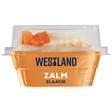 Ons zalm slaatje wordt gemaakt van zorgvuldig geselecteerde aardappelen, ASC-gecertificeerde zalm, en een mix van knapperige groenten zoals wortel, ui, en augurk.<lt/>br/<gt/> <lt/>br/<gt/> - Bereid met ASC-gecertificeerde zalm, duurzaam en lekker<lt/>br/<gt/> - Het lekkerste tussendoortje op aardappelbasis<lt/>br/<gt/> - Een kant-en-klaar slaatje, perfect voor één persoon<lt/>br/<gt/> - Smeuïge salade met wortel, ui, en augurk<lt/>br/<gt/> - Met zorg en vakmanschap gemaakt, proef de kwaliteit<lt/>br/<gt/> <lt/>br/<gt/> Over ons zalm slaatje: Ons zalmslaatje is gemaakt van zorgvuldig geselecteerde aardappelen, duurzame ASC-gecertificeerde zalm en een mix van knapperige groenten zoals wortel, ui en augurk. Het biedt een heerlijke, smeuïge salade, perfect als voedzaam tussendoortje. Ideaal voor elk moment, of je nu even snel wat energie nodig hebt tijdens het werk of jezelf wilt verwennen. Elke hap geeft je de energie om weer vol tegenaan te gaan. Deze kant-en-klare portie is perfect voor 1 persoon. Westland slaatjes vullen, zijn voedzaam én ontzettend lekker. Wij zijn dé trotse supporter van doorzetters, die wel een steuntje in de rug kunnen gebruiken.<lt/>br/<gt/> <lt/>br/<gt/> Over Westland Salades: Sinds 1969 maakt Westland Salades met veel vakmanschap en een flinke dosis nuchterheid de lekkerste en meest smeuïge salades op aardappelbasis. Al jaren is Westland Salades een begrip, van generatie op generatie. De ambachtelijke recepturen en specifieke bereiding geven onze producten die unieke Westland-smaak. En daar zijn we trots op! Wij besteden veel aandacht aan het sorteren van de beste ingrediënten en dat proef je! Daarnaast vinden we vakmanschap heel belangrijk en investeren we hier samen met onze mensen veel tijd in. Dat heeft ons groot gemaakt en die kwaliteit blijven we hoog houden.