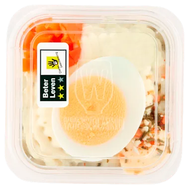 Ons ei slaatje wordt gemaakt met zorgvuldig geselecteerde aardappelen en 2 ster Beter Leven keurmerk eieren.<lt/>br/<gt/> <lt/>br/<gt/> - Een ambachtelijk en vers bereid vegetarisch slaatje<lt/>br/<gt/> - Het lekkerste tussendoortje op aardappelbasis<lt/>br/<gt/> - Een kant-en-klaar slaatje, perfect voor één persoon<lt/>br/<gt/> - Bereid met 2 ster Beter Leven-keurmerk eieren<lt/>br/<gt/> - Met zorg en vakmanschap gemaakt, proef de kwaliteit.<lt/>br/<gt/> <lt/>br/<gt/> Over ons ei slaatje: Ons ei slaatje is een ambachtelijk en vers bereid vegetarisch slaatje, gemaakt met zorgvuldig geselecteerde aardappelen en 2 ster Beter Leven keurmerk eieren. Het is het lekkerste tussendoortje op aardappelbasis, perfect voor 1 persoon. Ideaal voor elk moment van de dag, of je nu snel wat energie nodig hebt tijdens het werk of jezelf wilt verwennen met een heerlijk, voedzaam tussendoortje. Elke hap geeft je de energie om weer vol tegenaan te gaan. . Westland slaatjes vullen, zijn voedzaam én ontzettend lekker. Wij zijn dé trotse supporter van doorzetters, die wel een steuntje in de rug kunnen gebruiken.<lt/>br/<gt/> <lt/>br/<gt/> Over Westland Salades: Sinds 1969 maakt Westland Salades met veel vakmanschap en een flinke dosis nuchterheid de lekkerste en meest smeuïge salades op aardappelbasis. Al jaren is Westland Salades een begrip, van generatie op generatie. De ambachtelijke recepturen en specifieke bereiding geven onze producten die unieke Westland-smaak. En daar zijn we trots op! Wij besteden veel aandacht aan het sorteren van de beste ingrediënten en dat proef je! Daarnaast vinden we vakmanschap heel belangrijk en investeren we hier samen met onze mensen veel tijd in. Dat heeft ons groot gemaakt en die kwaliteit blijven we hoog houden.