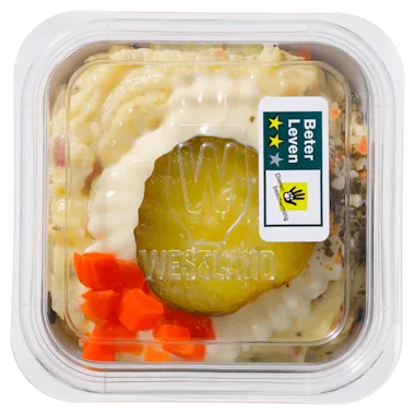 Ons huzaren slaatje wordt gemaakt van zorgvuldig geselecteerde aardappelen, vers 2 ster Beter Leven keurmerk rundvlees, en een frisse piccalilly twist.<lt/>br/<gt/> <lt/>br/<gt/> - Huzaren salade verfrist met een piccalilly twist<lt/>br/<gt/> - Het lekkerste tussendoortje op aardappelbasis<lt/>br/<gt/> - Een kant-en-klaar slaatje, perfect voor één persoon<lt/>br/<gt/> - Bereid met rundvlees met het Beter Leven-keurmerk 2 ster<lt/>br/<gt/> - Met zorg en vakmanschap gemaakt, proef de kwaliteit.<lt/>br/<gt/> <lt/>br/<gt/> Over ons huzaren slaatje: Ons huzarenslaatje is een heerlijke combinatie van zorgvuldig geselecteerde aardappelen, vers rundvlees met het 2-sterren Beter Leven-keurmerk, en een frisse piccalilly twist. Het is het lekkerste tussendoortje op aardappelbasis, smeuïg en boordevol knapperige groenten zoals wortel, ui en augurk. Ideaal voor elk moment van de dag, of je nu snel wat energie nodig hebt tijdens het werk of jezelf wilt verwennen. Elke hap geeft je de energie om weer vol tegenaan te gaan. Deze kant-en-klare portie is perfect voor 1 persoon. Westland slaatjes vullen, zijn voedzaam én ontzettend lekker. Wij zijn dé trotse supporter van doorzetters. <lt/>br/<gt/> <lt/>br/<gt/> Over Westland Salades: Sinds 1969 maakt Westland Salades met veel vakmanschap en een flinke dosis nuchterheid de lekkerste en meest smeuïge salades op aardappelbasis. Al jaren is Westland Salades een begrip, van generatie op generatie. De ambachtelijke recepturen en specifieke bereiding geven onze producten die unieke Westland-smaak. En daar zijn we trots op! Wij besteden veel aandacht aan het sorteren van de beste ingrediënten en dat proef je! Daarnaast vinden we vakmanschap heel belangrijk en investeren we hier samen met onze mensen veel tijd in. Dat heeft ons groot gemaakt en die kwaliteit blijven we hoog houden.