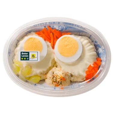 Ingrediënten: aardappel, water, plantaardige oliën (raapzaad, zonnebloem), 11% EI Beter Leven 2 sterren, wortel, zilverui (bevat SULFIET), azijn, suiker, augurk, 2% SCHARRELEI, doperwten, zout, maïszetmeel, ui, SCHARRELEIGEEL, gemodificeerd zetmeel (maïs, aardappel), conserveermiddelen (E202, E211), gehydrolyseerde plantaardige eiwitten (SOJA, maïs), maïs, kruiden, dextrose, specerijen (bevat MOSTERD), gedroogde groenten (ui, wortel, pastinaak, tomaat, paprika), aroma's (bevat SOJA, MOSTERD), verdikkingsmiddel (E415), voedingszuren (E270, E330), glucosestroop, antioxidant (E300), kleurstoffen (E101, E160a), natuurlijk aroma, zuurteregelaar (E325), SOJAbonenpoeder, TARWE, gistextract, specerijextracten (knoflook, dille), maltodextrine.