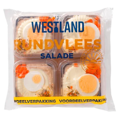 Ons rundvlees slaatje wordt gemaakt van zorgvuldig geselecteerde aardappelen, vers rundvlees, en een mix van knapperige groenten zoals wortel, ui, en augurk. <lt/>br/<gt/> <lt/>br/<gt/> - Als beste getest (Smaaktest Rundvleessalade, de Telegraaf, mei 2023) <lt/>br/<gt/> - Het lekkerste tussendoortje op aardappelbasis<lt/>br/<gt/> - Een kant-en-klaar slaatje, perfect om te delen<lt/>br/<gt/> - Nog meer genieten van de Westland salades in 4-pack!<lt/>br/<gt/> - Met zorg en vakmanschap gemaakt, proef de kwaliteit.<lt/>br/<gt/> <lt/>br/<gt/> Over het rundvlees slaatje 4-pack: Het rundvlees slaatje van Westland Salades keer 4, om zelf op te eten of samen te delen. Een kant en klaar slaatje perfect om te delen. Ons rundvleesslaatje wordt gemaakt van zorgvuldig geselecteerde aardappelen, vers rundvlees en een mix van knapperige groenten zoals wortel, ui en augurk. Heerlijk als tussendoortje! Het rundvleesslaatje is ideaal voor elk moment. Of je nu snel wat energie nodig hebt tussen het werk door of jezelf wilt verwennen. Westland slaatjes vullen, zijn voedzaam én ontzettend lekker. Wij zijn dé trotse supporter van doorzetters.<lt/>br/<gt/> <lt/>br/<gt/> Over Westland Salades: Sinds 1969 maakt Westland Salades met veel vakmanschap en een flinke dosis nuchterheid de lekkerste en meest smeuïge salades op aardappelbasis, beter bekend als het oudhollandse slaatje. Al jaren is Westland Salades een begrip. De ambachtelijke recepturen en specifieke bereiding geven onze producten die unieke Westland-smaak. En daar zijn we trots op! Bij Westland Salades geloven we in kwaliteit. Wij besteden veel aandacht aan het selecteren van de beste ingrediënten en dat proef je! Daarnaast vinden we vakmanschap heel belangrijk en investeren we hier samen met onze mensen veel tijd in. Dat heeft ons groot gemaakt en die kwaliteit blijven we hoog houden.
