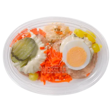 Ons rundvlees slaatje wordt gemaakt van zorgvuldig geselecteerde aardappelen, vers rundvlees, en een mix van knapperige groenten zoals wortel, ui, en augurk. Lekker als tussendoortje, thuis of onderweg!<lt/>br/<gt/> <lt/>br/<gt/> - Als beste getest (Smaaktest Rundvleessalade, de Telegraaf, mei 2023)<lt/>br/<gt/> - Het lekkerste tussendoortje op aardappelbasis<lt/>br/<gt/> - Een kant-en-klaar slaatje, perfect voor één persoon<lt/>br/<gt/> - Bereid met het lekkerste verse rundvlees<lt/>br/<gt/> - Met zorg en vakmanschap gemaakt, proef de kwaliteit.<lt/>br/<gt/> <lt/>br/<gt/> Over ons rundvlees slaatje: Ons rundvleesslaatje wordt gemaakt van zorgvuldig geselecteerde aardappelen, vers rundvlees en een mix van knapperige groenten zoals wortel, ui en augurk. Heerlijk als tussendoortje! Het rundvleesslaatje is ideaal voor elk moment. Of je nu snel wat energie nodig hebt tussen het werk door of jezelf wilt verwennen met een heerlijk, voedzaam tussendoortje. Kant-en-klaar en heerlijk voor de harde werker. Westland slaatjes vullen, zijn voedzaam én ontzettend lekker. Wij zijn dé trotse supporter van doorzetters, die wel een steuntje in de rug kunnen gebruiken.<lt/>br/<gt/> <lt/>br/<gt/> Over Westland Salades: Sinds 1969 maakt Westland Salades met veel vakmanschap en een flinke dosis nuchterheid de lekkerste en meest smeuïge salades op aardappelbasis, beter bekend als het oudhollandse slaatje. Al jaren is Westland Salades een begrip, van generatie op generatie. De ambachtelijke recepturen en specifieke bereiding geven onze producten die unieke Westland-smaak. En daar zijn we trots op! Bij Westland Salades geloven we in kwaliteit. Wij besteden veel aandacht aan het selecteren van de beste ingrediënten en dat proef je! Daarnaast vinden we vakmanschap heel belangrijk en investeren we hier samen met onze mensen veel tijd in. Dat heeft ons groot gemaakt en die kwaliteit blijven we hoog houden.