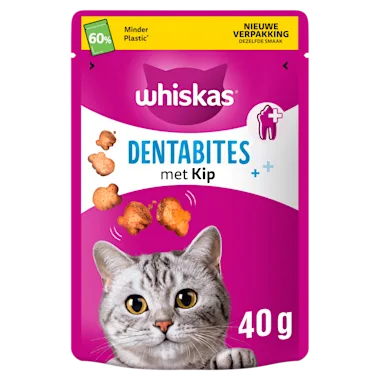 WHISKAS® Dental Treats biedt onweerstaanbaar smakelijke tussendoortjes voor je kat. Deze krokante snacks met kip zijn gemaakt van hoogwaardige ingrediënten. Ze dragen bij aan de gezondheid van je kat door de toevoeging van Omega 3, vitaminen en mineralen. Een onweerstaanbare snack om je kat gezond en gelukkig te houden. De vernieuwde, duurzame verpakking biedt dezelfde heerlijke smaak, maar met 60% minder plastic!