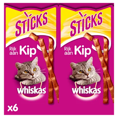 Deze Whiskas sticks bevatten 6 heerlijke snoepstokjes in de smaak kip. De verpakking bevat 6 sticks die individueel zijn verpakt om de snack lekkers vers te houden. De sticks zijn voorzien van handige breekpunten zodat je het snoepstokje in kleinere stukjes kan breken. Je kat zal het heerlijk vinden om te knabbelen aan de stick, maar je kan hem ook in stukjes breken en door de kamer gooien. Laat je kat maar lekker moeite doen voor zijn traktatie!