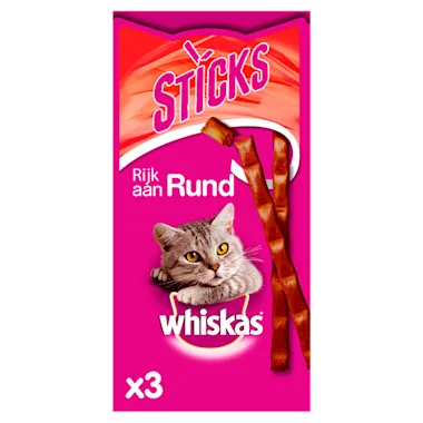 Deze Whiskas sticks bevatten 3 heerlijke snoepstokjes in de smaak rund. De verpakking bevat 3 sticks die individueel zijn verpakt om de snack lekkers vers te houden. De sticks zijn voorzien van handige breekpunten zodat je het snoepstokje in kleinere stukjes kan breken. Je kat zal het heerlijk vinden om te knabbelen aan de stick, maar je kan hem ook in stukjes breken en door de kamer gooien. Laat je kat maar lekker moeite doen voor zijn traktatie!