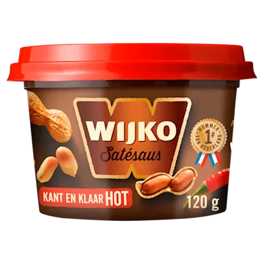 Ingrediënten: Water, PINDA'S 24%, suiker, sojasaus (water, SOJABONEN, zout, TARWE, conserveermiddel (kaliumsorbaat)), azijn, gehydrolyseerd SOJA-eiwit, weipoeder (MELK), sambal (rode pepers 1,1%, zout, voedingszuur (azijnzuur), conserveermiddel (benzoëzuur)), gemodificeerd zetmeel, raapzaadolie, specerijen, zout, emulgator (SOJALECITHINE), voedingszuren (melkzuur, natriumlactaat), uienpoeder, gember, conserveermiddel (kaliumsorbaat), aroma, extract van paprika.