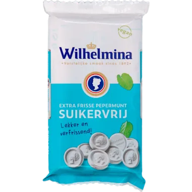 Heerlijk frisse, suikervrije mints van Wilhelmina. In een handig flip top doosje om mee te nemen onderweg. Per 2 stuks verpakt.