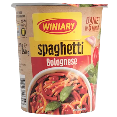 Ingrediënten: spaghettipasta 54,1% (harde tarwegriesmeel, EIEREN), gedroogde groenten 13,9% (tomaat 11,6%, ui, knoflook, prei), aardappelzetmeel, suiker, maltodextrine, palmvet, aroma's (van TARWE), zout, gerookt varkensvleesvet, kruiden, gefermenteerd TARWE-eiwit), specerijen, kleurstof (paprika-extract). Kan soja, MELK, SELDERIJ, mosterd bevatten.