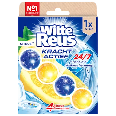 Op zoek naar een makkelijke manier om uw toilet schoon en fris te houden? Het Witte Reus kracht actief citrus wc-blok zorgt voor een schoon en fris toilet van de eerste tot de laatste spoelbeurt. Het Witte Reus kracht actief toiletblok bestaat uit een formule met vier functies: het reinigend schuim zorgt ervoor dat uw toilet bij elke spoelbeurt krachtig gereinigd wordt. Dankzij de anti-kalk formule wordt kalkaanslag in het toilet voorkomen. Het Witte Reus kracht actief citrus toiletblok bevat een vuilbeschermer, die de vorming van vuil tussen de schoonmaakbeurten door voorkomt. Een frisse citrusgeur zal worden verspreid, dankzij het luchtverfrissereffect, van de eerste tot de laatste spoelbeurt. Zo krijg je een heerlijk fris toilet! Duurzame keuze: het karton en de houder zijn 100% recyclebaar. Probeer ook de frisse geur van de andere Witte Reus kracht actief toiletblok varianten!