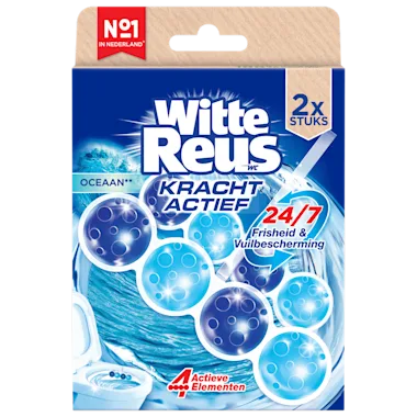 Op zoek naar een makkelijke manier om uw toilet schoon en fris te houden? Het Witte Reus kracht actief oceaan wc-blok zorgt voor een schoon en fris toilet van de eerste tot de laatste spoelbeurt. Het Witte Reus kracht actief toiletblok bestaat uit een formule met vier functies: het reinigend schuim zorgt ervoor dat uw toilet bij elke spoelbeurt krachtig gereinigd wordt. Dankzij de anti-kalk formule wordt kalkaanslag in het toilet voorkomen. Het Witte Reus kracht actief oceaan toiletblok bevat een vuilbeschermer, die de vorming van vuil tussen de schoonmaakbeurten door voorkomt. Een frisse oceaangeur zal worden verspreid, dankzij het luchtverfrissereffect, van de eerste tot de laatste spoelbeurt. Zo krijg je een heerlijk fris toilet! Duurzaamheid: het karton en de houder zijn 100% recyclebaar. Probeer ook de frisse geur van de andere Witte Reus kracht actief toiletblok varianten!