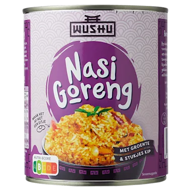 Ingrediënten: 47% rijst, 39% groenten (prei, paprika rood, ui, wortel), 8% hamblokjes (mechanisch gescheiden varkensvlees, water, aardappelzetmeel, varkenshemoglobine, varkenseiwitten, dextrose, zout, stabilisatoren: E450/E452, conserveermiddel: E250), raapzaadolie, zout, knoflook, natuurlijk aroma, ketjap (melasse, water, sojasaus (SOJAbonen, zout, conserveermiddel: E211, kleurstof: E150d), voedingszuur: melkzuur, natuurlijk aroma) , specerijen, E = door de EU goedgekeurde hulpstoffen.