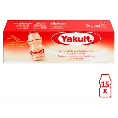Yakult Original bevat 20 miljard L. casei shirota bacteriën per flesje, die levend de darmen bereiken. Yakult Original is lekker op ieder moment van de dag en past in een goede leefstijl.