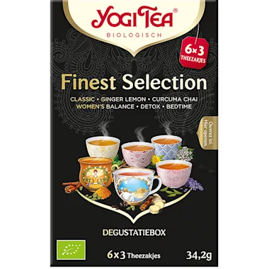 "Yogi Tea Finest Selection biedt een unieke mix van 6 geliefde biologische theeën in één doosje: Classic, Ginger Lemon, Curcuma Chai, Women's Balance, Detox en Bedtime. Geniet van de perfecte balans tussen kruidige, frisse en zoete smaken, zorgvuldig samengesteld voor elk moment van de dag. Ideaal om nieuwe smaken te ontdekken of je favorieten altijd bij de hand te hebben. Breng welzijn en harmonie in je dagelijkse theemomenten met deze veelzijdige selectie van Yogi Tea."