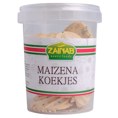 Ingrediënten: Maiszetmeel, plantaardige margarine (palm-, raapdzaad, kokos), suiker, EI, magere MELKpoeder, musketzaad (kleurstof E100, E120, E131, TARWEzetmeel), vanille aroma (vanille, sinaasappel, citroen).