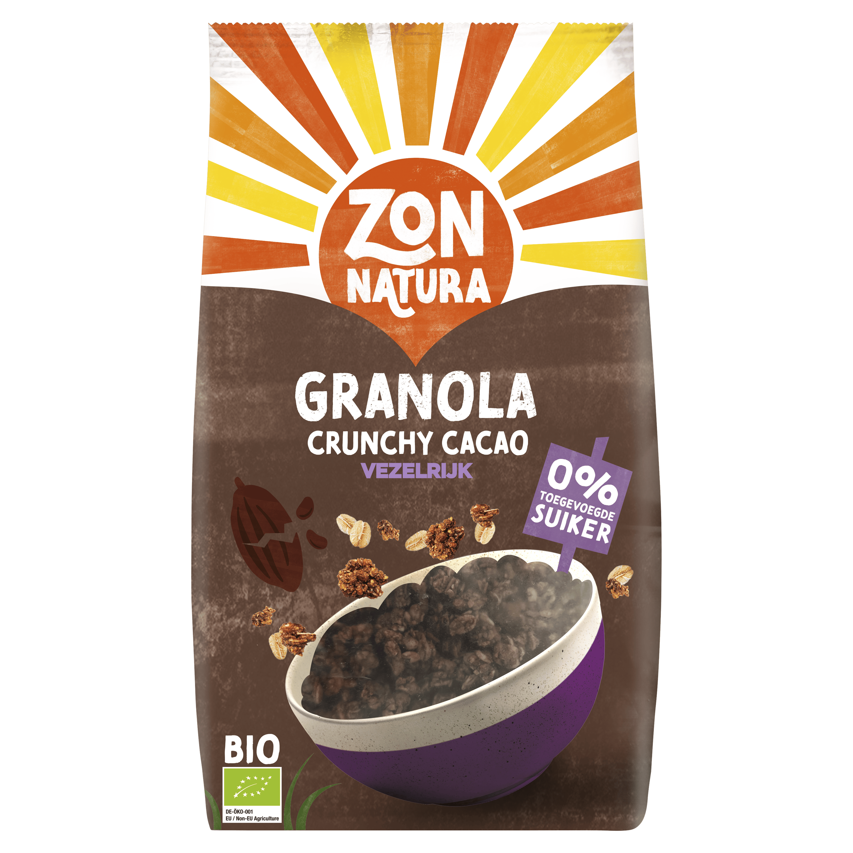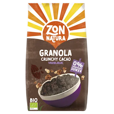 Ingrediënten: volkoren SPELTvlokken* [TARWE] 33%, volkoren HAVERvlokken* [GLUTEN] 32%, cichoreiwortelvezel*, gepofte rijst* 6,7% (rijstmeel*), gedroogde kokosnoot*, zonnebloemolie (zonnebloemolie*, antioxidant: tocoferolrijk extract), TARWEbloem* 4%, cacaopoeder* 3,3%, antioxidant: SOJAlecithine*, zeezout. *Ingrediënt van biologische teelt. Kan noten, melk en sesamzaad bevatten.