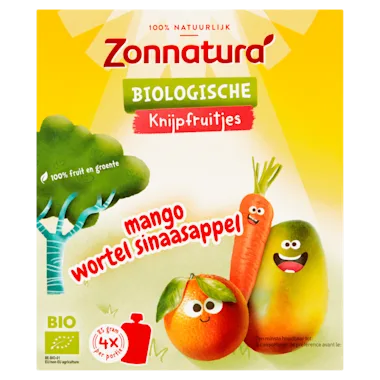 mango* 28%, wortel* 28%, appel* 28%, banaan* 14%, geconcentreerd sinaasappelsap* 2%, geconcentreerd citroensap. *ingrediënt van biologische teelt.