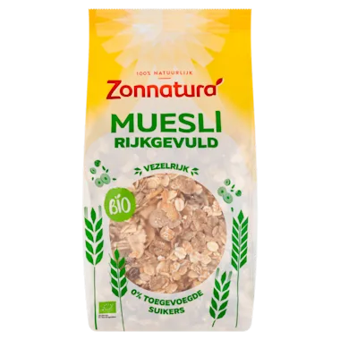 Ingrediënten: volkoren granen* 75% (HAVER*, TARWE* [GLUTEN], GERST*, ROGGE*, geroosterde TARWEvlokken*, TARWEvlokken* (volkoren TARWEmeel*)), rozijnen* 14% (rozijnen*, zonnebloemolie*), bananenchips* 6% (banaan*, kokosolie*), SOJAvlokken*, zonnebloempitten* 2%, HAZELNOTEN* 2%. *Ingrediënt van biologische teelt. Kan sporen bevatten van andere noten, melk en sesamzaad.