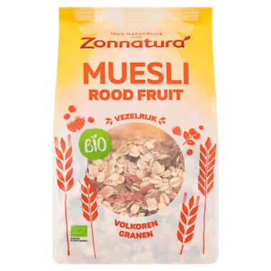 Ingrediënten: graanvlokken* 73% (haver* 42%, tarwe* [GLUTEN] 15%, spelt* 9%, gemoute tarwe* 7% (tarwe*, gerstemout*)), rozijnen* 22% (rozijnen*, zonnebloemolie*), amandelen* [NOTEN] 2%, zonnebloempitten* 2%, roodfruit* 1,5% (cranberry* 0,5%, aardbei* 0,5%, zwarte bes* 0,5%).*ingrediënten van biologische teelt. Dit product kan sporen bevatten van MELK, SOJA en SESAMzaad.