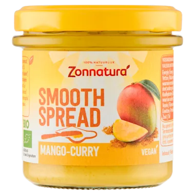 Ingrediënten: mangopuree* 25%, koolzaadolie*, sinaasappelsap uit concentraat*, zonnebloempitten*, water, citroensap uit citroensapconcentraat*, agavesiroop*, kokosmelk* (kokosnootvlees*, water), kerriepoeder* 1,5% (koriander*, kurkuma*, venkel*, fenegriek*, karwij*, gember*, ui*, paprika*, knoflook*, kaneel*, chili*), zeezout, fruitazijn*, plantaardig eiwit uit zonnebloempitten*, tapiocazetmeel*, witte peper*, chilipoeder*. *Ingrediënt van biologische teelt.