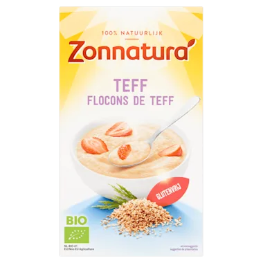 Magnetron 800W: meng 200 ml melk of plantaardige drink met 4 eetlepel (of naar smaak) teffvlokken in een kom. Verwarm 2 minuten in de magnetron. Roer het even goed door.